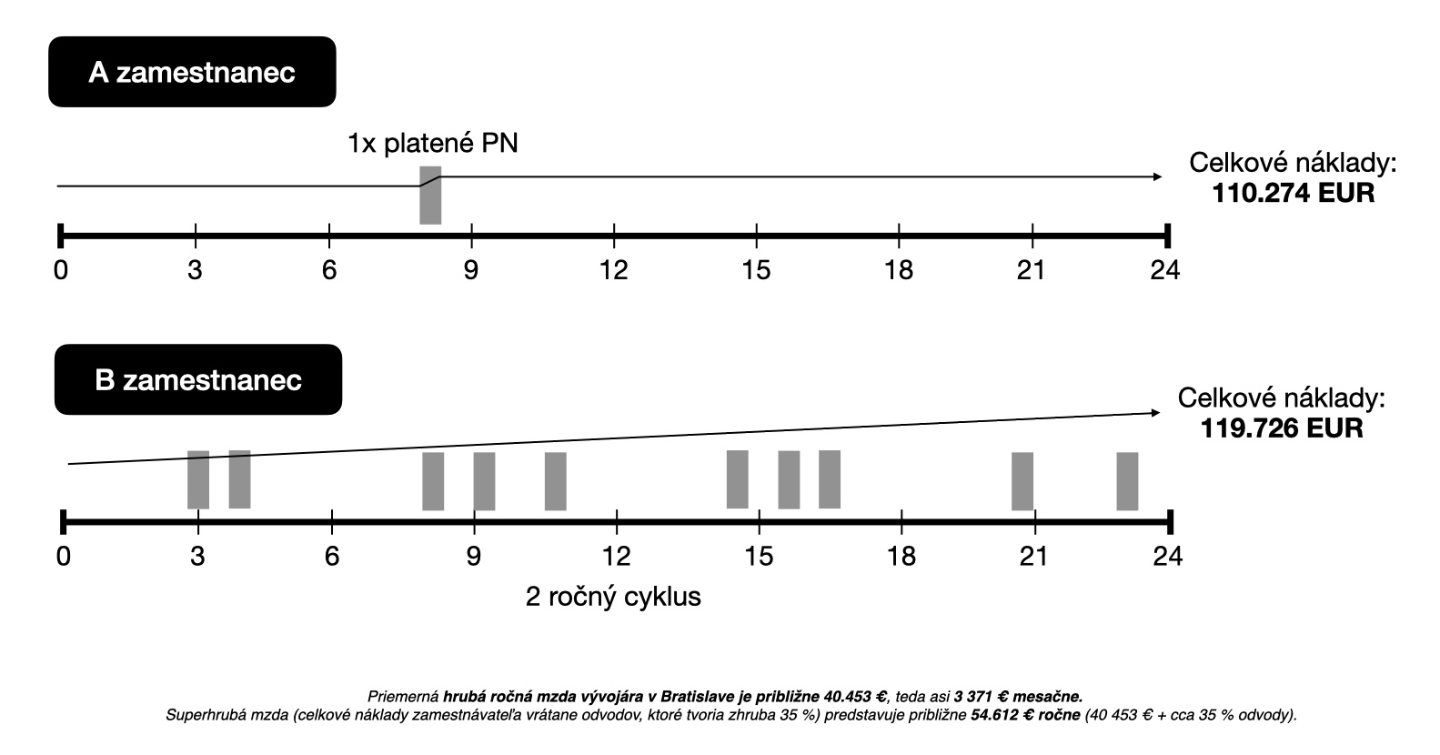 Teraz si na grafe pozrime dvoch zamestnancov A a B. Kým A má za 2 roky PN len jeden krát, pretože sa o svoje zdravie stará dôsledne, B zamestnanec bol PN 10x. Rozdiel za platenú PN pri oboch zamestnancov na konci dvojročného cyklu je z pohľadu financií významný.