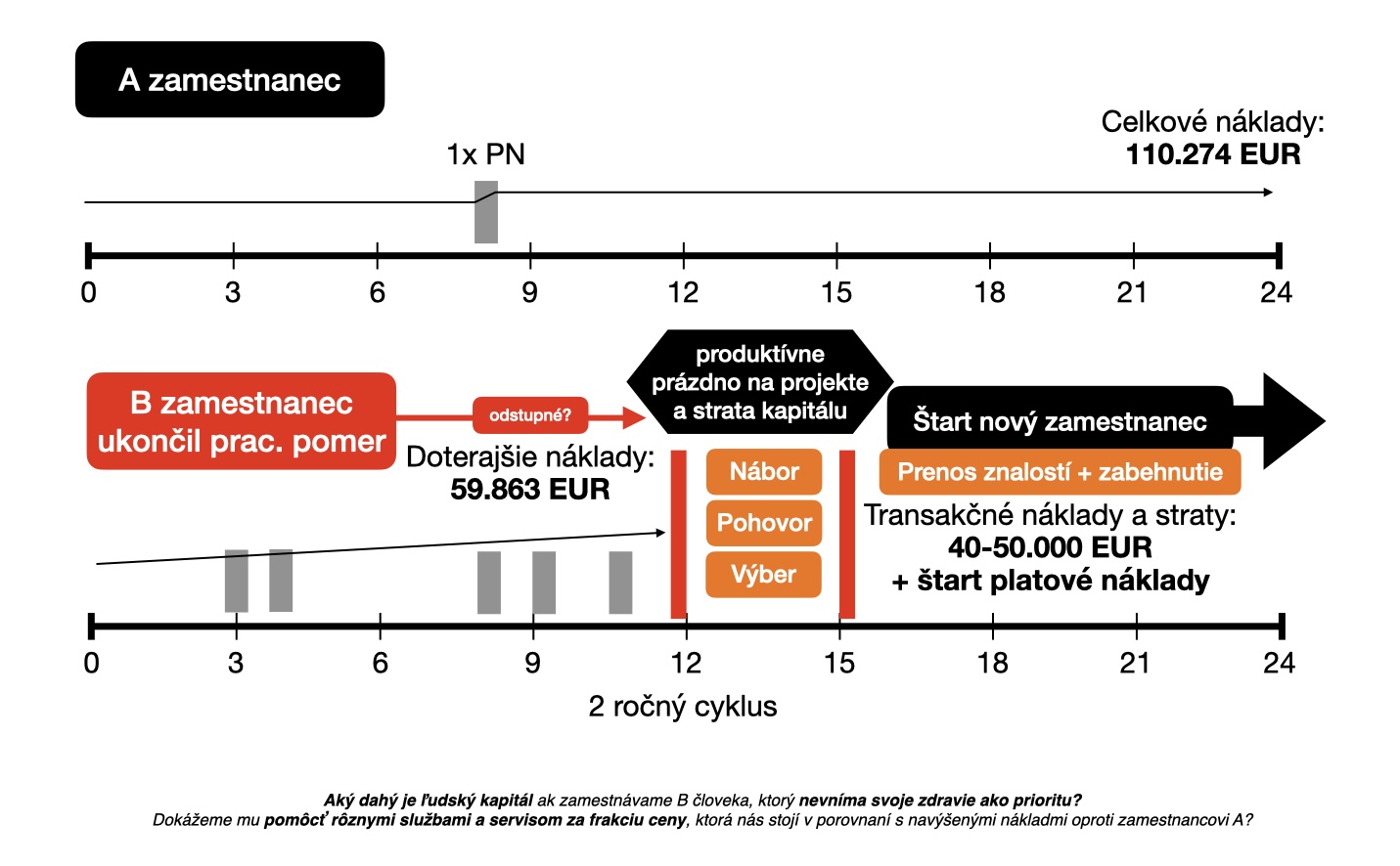 Grafika jasne ukazuje dopad absencií – hoci priame mzdové náklady sú rovnaké, vyššia chorobnosť u zamestnanca B zvyšuje celkové výdavky za 2 roky o takmer 9.452 EUR. Nezrátavame tam ekonomický fakt, že každý zamestnanec má pre zamestnávateľa vyprodukovať v rámci svojho platu minimálne 5x takú kapitálovú hodnotu (ideálne 10 x). Avšak toto je ešte pomerne lacná situácia, ale omnoho finančne náročnejšia je situácia ak bude potrebné zamestnanca B vymeniť a vzniknú tak významne vyššie transakčné náklady, ktoré znázorňuje nasledovný graf: