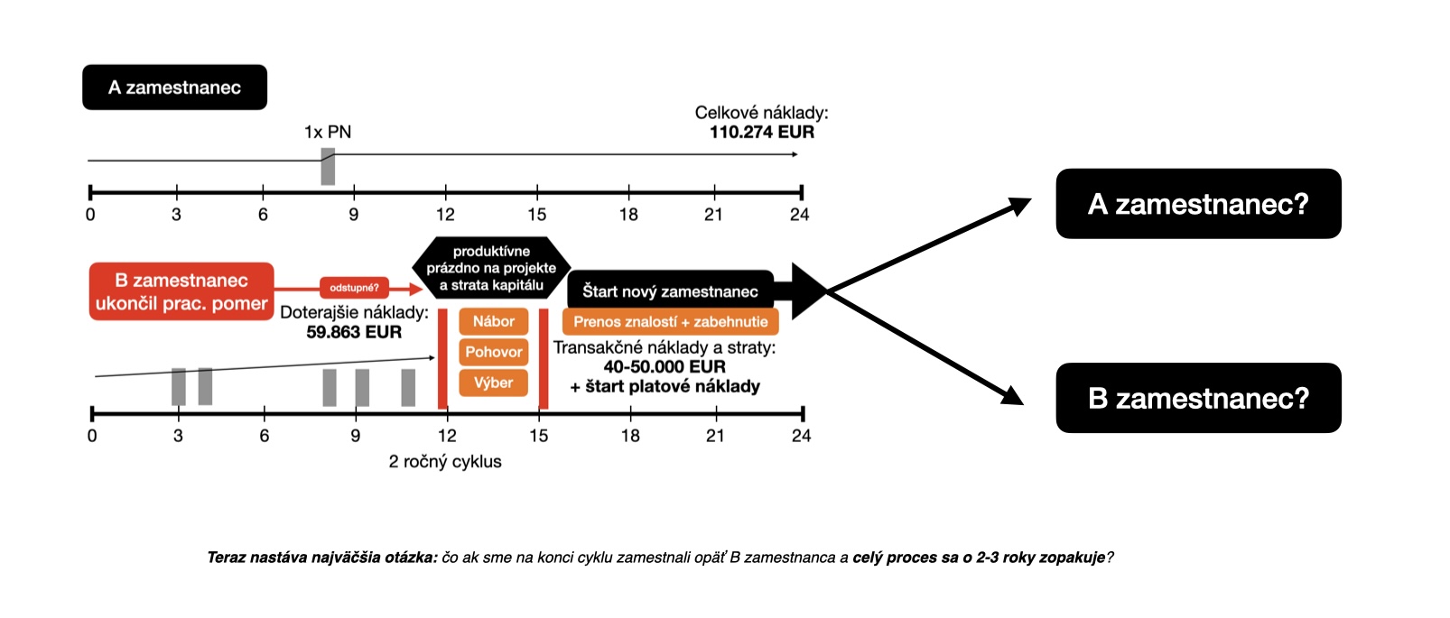 A teraz si predstavte, že nejde o priemerného zamestnanca, ale strategicky dôležitého človeka pre firmu, ktorého plat je podstatne vyšší. A teraz si ešte predstavte, že hoci sa proces úspešne podarilo zvládnuť, nový človek už pracuje a prináša kvalifikovanú ľudskú prácu (kapitál pre firmu), tak stále nevieme, či sme zamestnali A alebo B zamestnanca, ktorý nám cyklus o 2-3 roky opäť zopakuje.