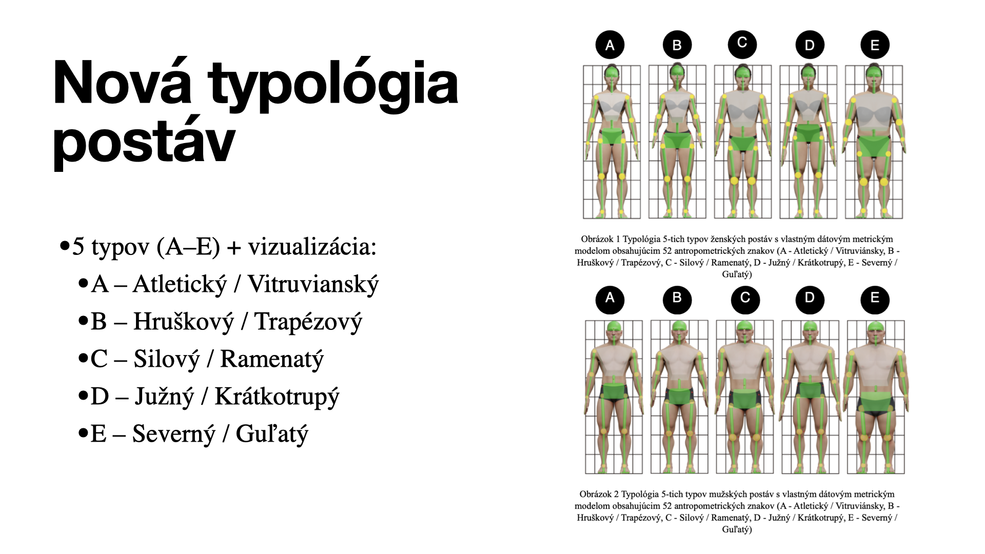 Za posledné roky som sa intenzívne venoval výskumu typológie ľudského tela z pohľadu športového výkonu a genetických predispozícií. Zistil som, že dnes používané klasifikácie, ako je napríklad Sheldonova typológia (ektomorf, mezomorf, endomorf), nám v skutočnosti neposkytujú dostatok relevantných informácií pre moderný výskum či prax vo vrcholovom športe a prevencii. V spolupráci s technologickými a vedeckými partnermi sme preto navrhli a testovali novú typológiu postáv rozdelenú do 5 hlavných typov (A až E), ktoré zohľadňujú: