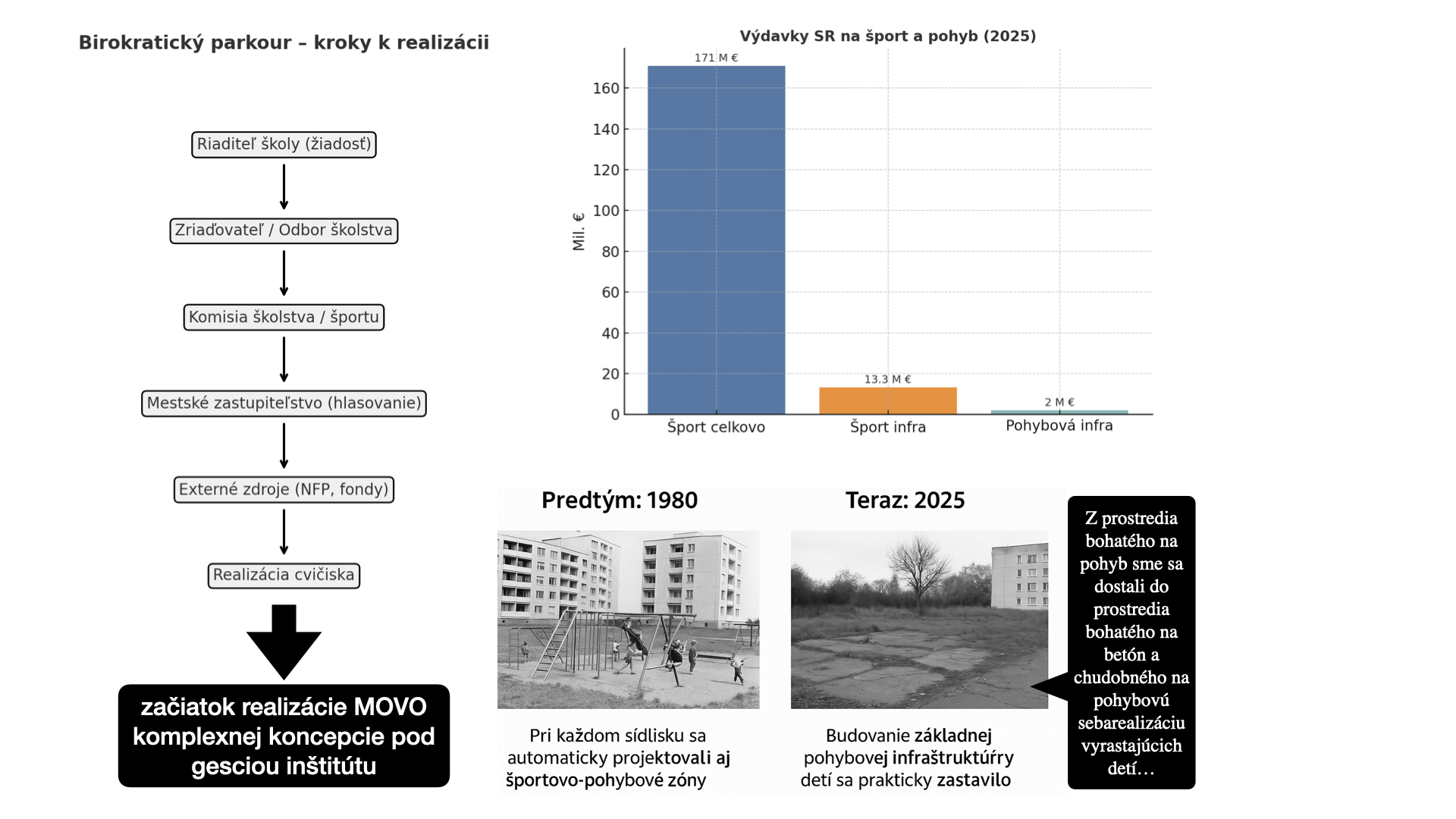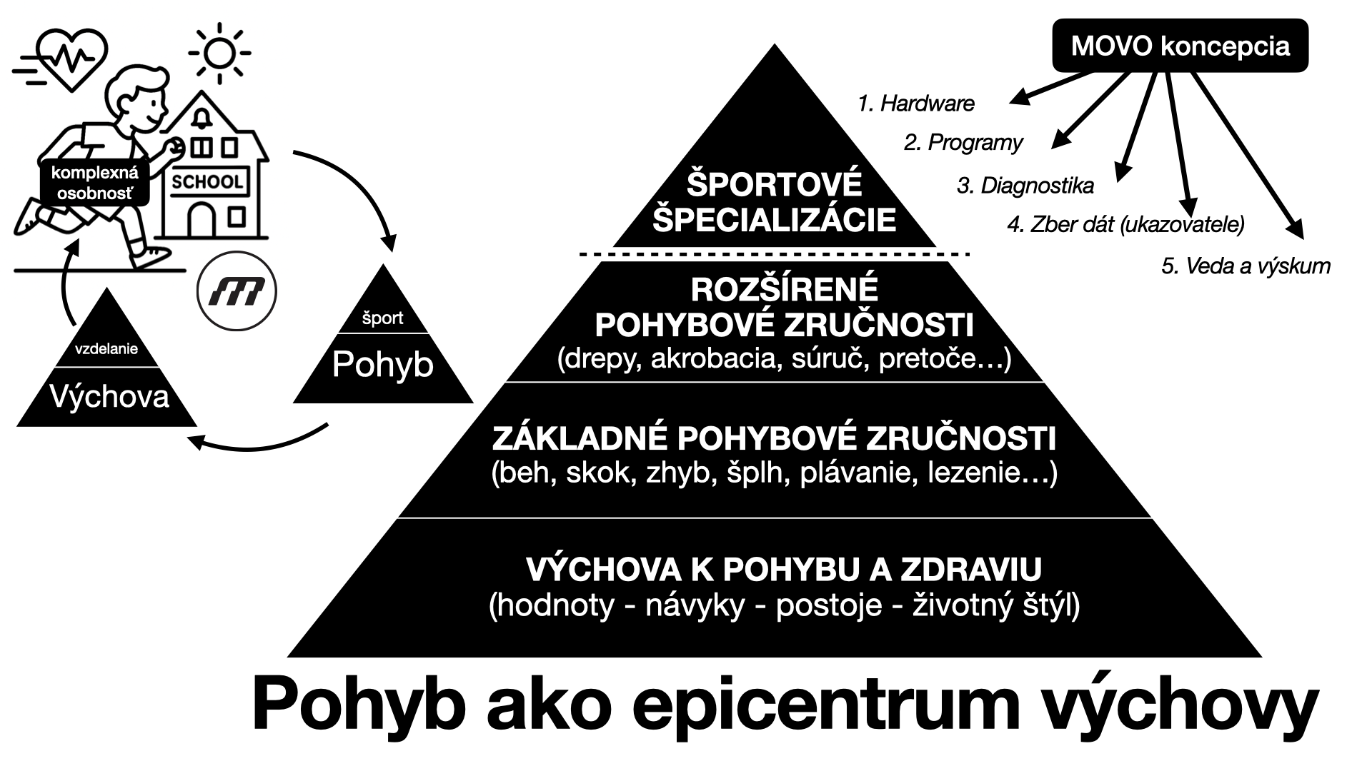 A to je tragický nepomer. Preto potrebujeme projekty, ktoré systematicky budujú prostredie bohaté na pohyb – priamo v školách, kde deti trávia väčšinu svojho dňa. Jednoducho rodič prestane robiť taxikára pre svoje deti, aby im doprial zmysluplné pohybové vyžitie, ale pohybové programy a rozvoj základnej pohybovej gramotnosti príde priamo do školy za deťmi. A na tom tvrdo pracujeme aj prostredníctvom projektu MOVO. To ale nestačí a posúvame to ďalej.