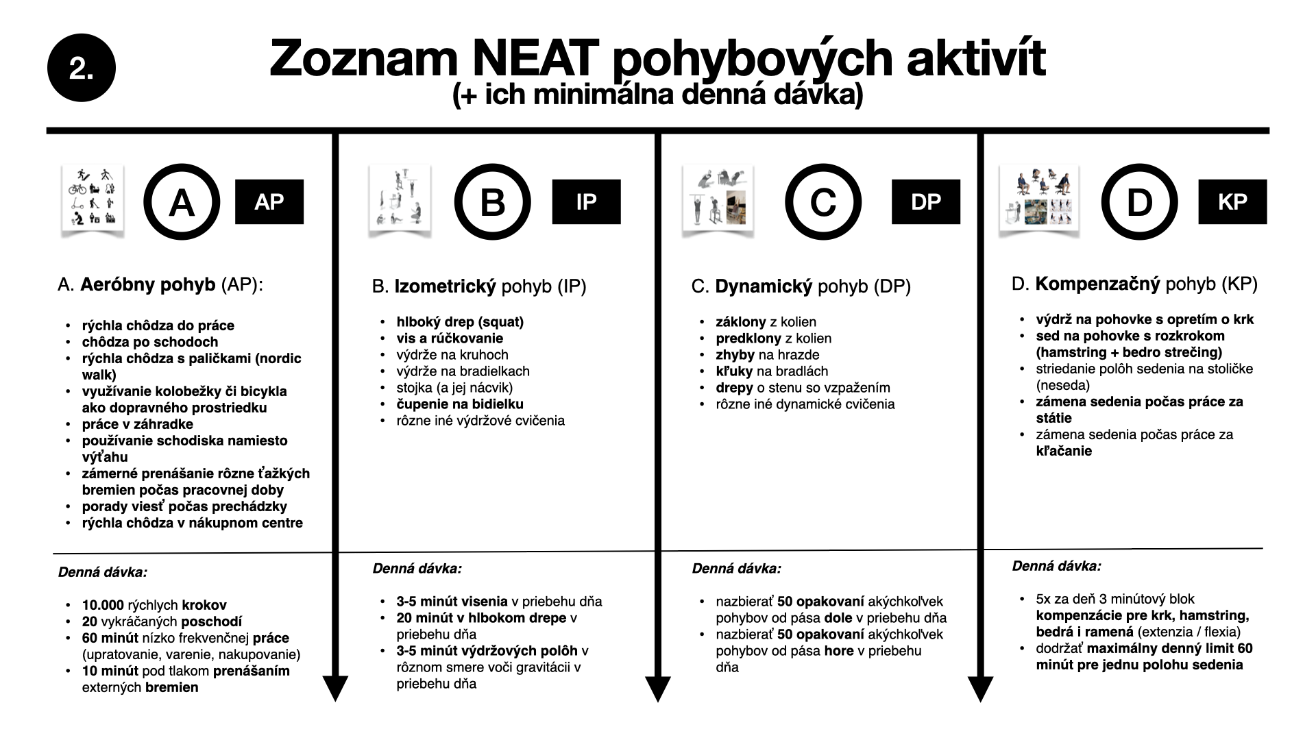 - 3) vytvorí sa denný pohybový predpis: druh pohybu a ich odporúčaný objem