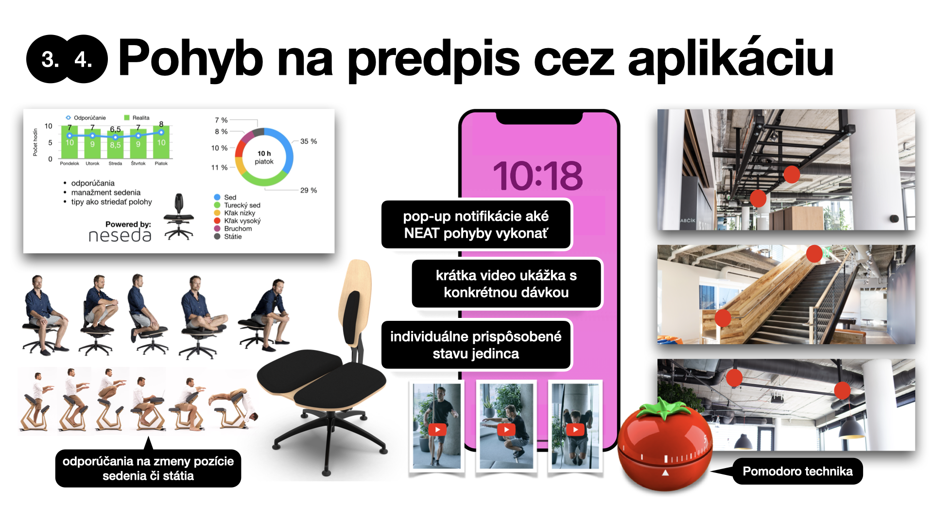 Pohyb na predpis je veľká téma, pretože každý z nás má iný zdravotný problémy a bolesti, ktoré plynú z celodenného sedenia. Sedavé zamestnanie výrazne zvyšuje riziko zdravotných problémov (bolesti chrbtice, nadváha, vysoký krvný tlak, stres). Dôsledkom sú opakujúce sa PN, znížený výkon a zvýšená fluktuácia zamestnancov. Priame a nepriame náklady na výmenu zamestnanca predstavujú približne 40 až 70.000 EUR. Každé ušetrené odchody a náklady na výmenu zamestnanca znamenajú úsporu rádovo desiatok tisíc EUR.