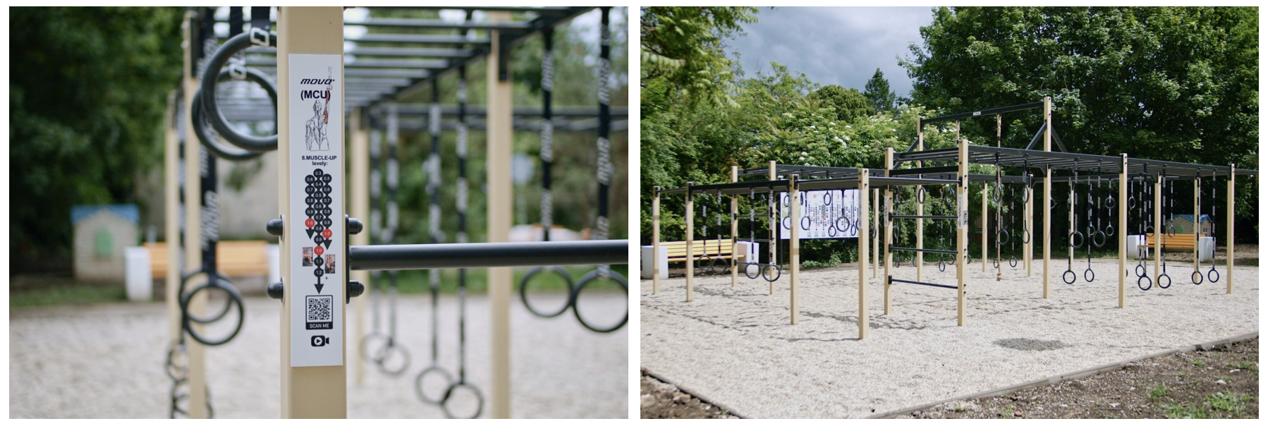 Pri práci s MOVO parkom sme objavili zaujímavý fenomén. Deti mimoriadne obľubujú možnosť vešania sa na hrazdách (rúčkovanie) ale aj prácu na gymnastických kruhoch. Tým že MOVO park je certifikovaný pre deti od 6 rokov, tak od prvého školského stupňa je využiteľný minimálne na 7 a viac mesiacov v roku. Štrková dopadová plocha zabraňuje všetkým zranenia, pretože 30 cm plaveného štrku (frakcia 4-8 mm) funguje ako žinenka.