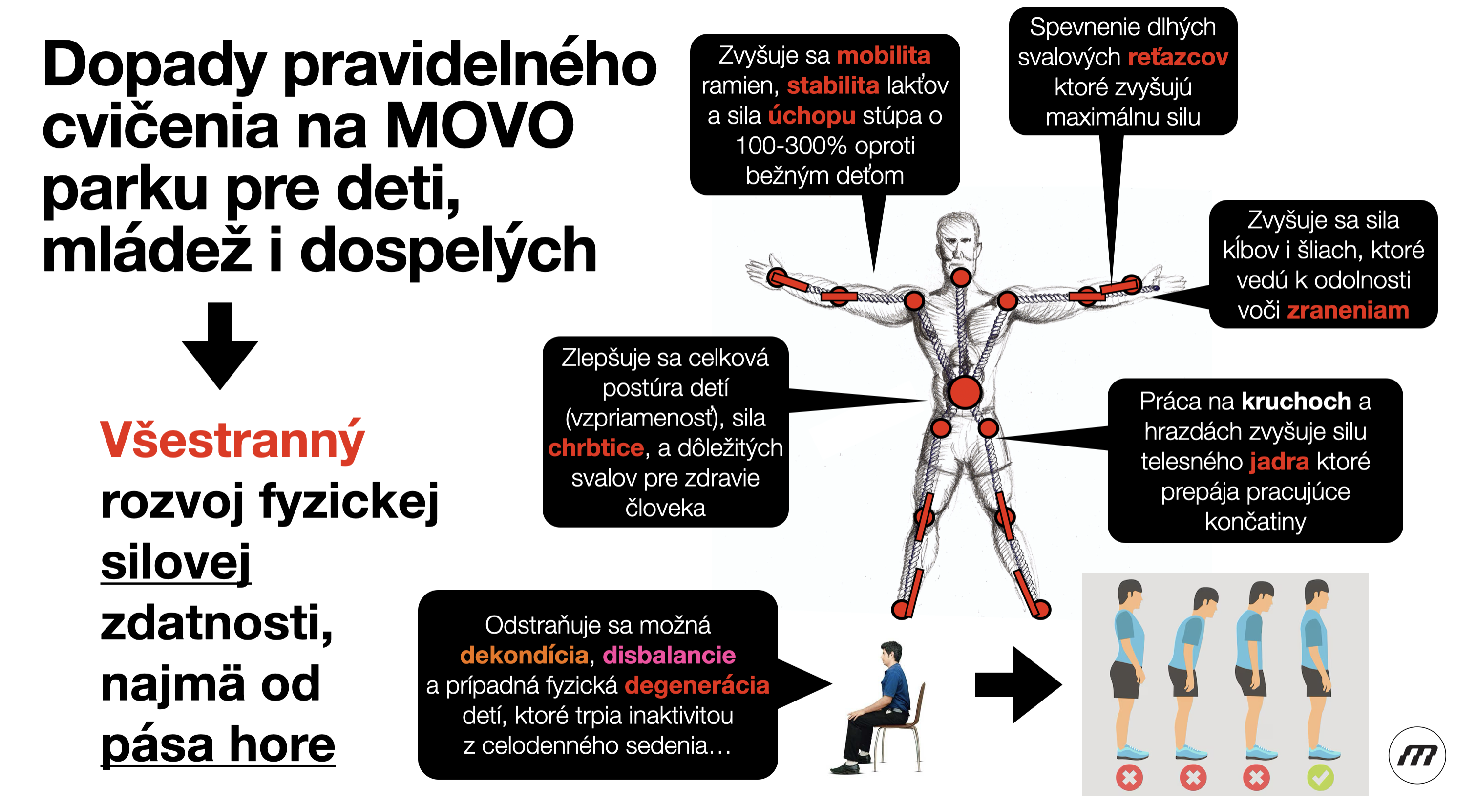 Vytvoril som sériu inovatívnych certifikovaných cvičísk pre deti od 6 rokov, ktoré majú vysokú kapacitu, môže ich použiť celá trieda a obsahuje všetky dôležité prvky na všestranný rozvoj silovej fyzickej zdatnosti detí i mládeže. Ako to na takom "bežnom" MOVO parku chodí, si môžete pozrieť z nasledujúceho videa: