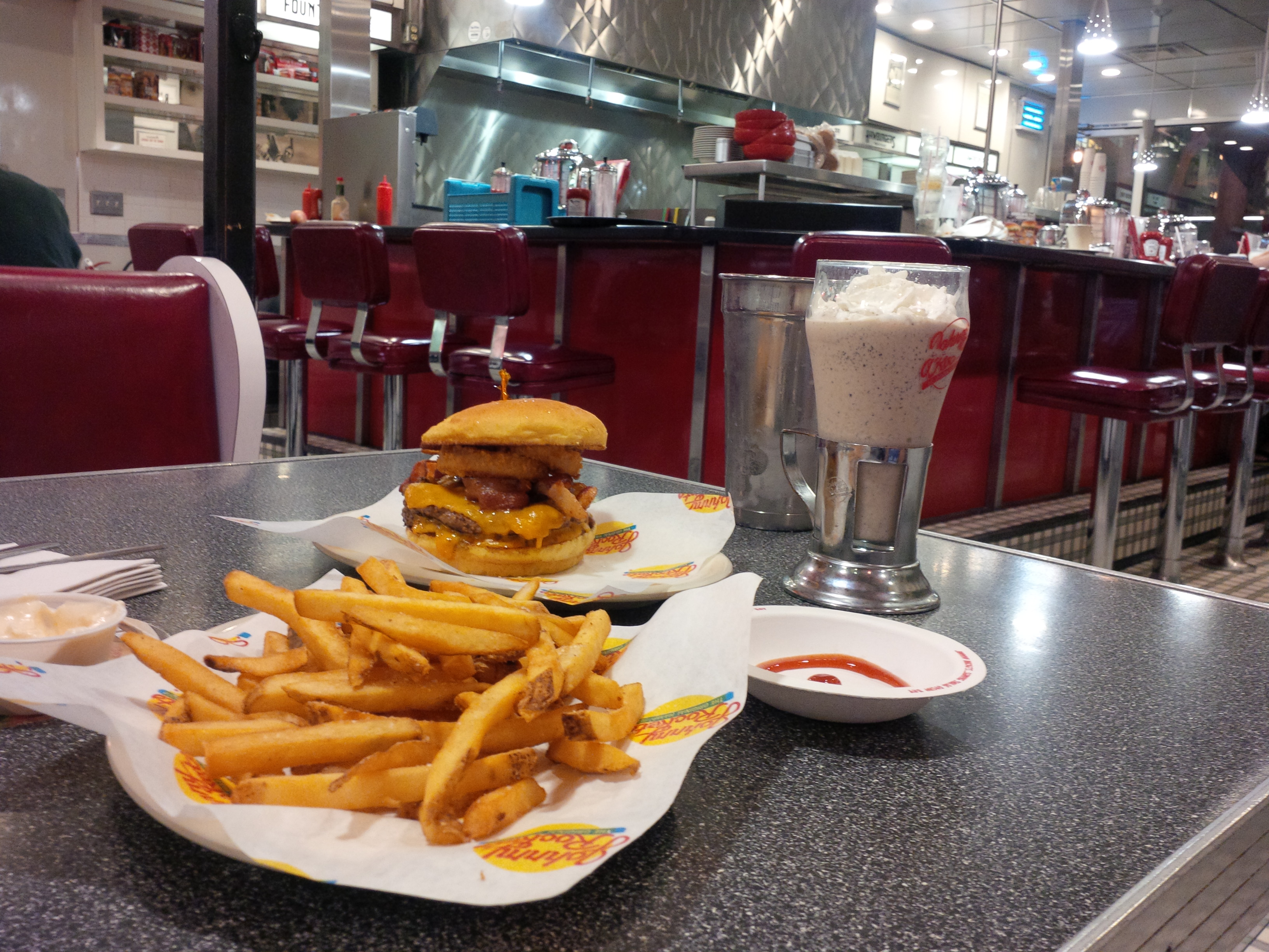 Tina: Reštaurácie ponúkajúce burgre je ťažké obísť, keď ste v Amerike. Je to niečo, čo definitívne treba ochutnať a vychutnať si (hoci vieme že to nie je žiadna sláva). Pečené hovädzie, slanina, cibuľa, horčica, delikátne proamerické chute, k tomu celému shake so slaného karamelu a my sme sa mohli odgúľať do auta :) (cheat day konečná).