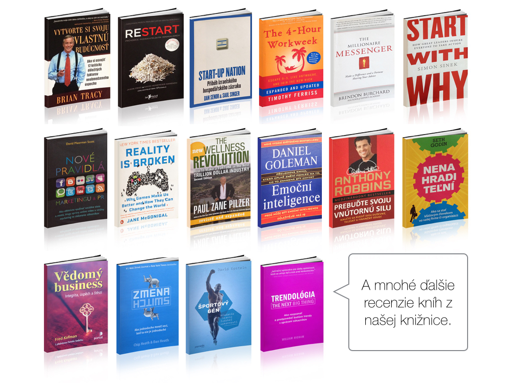 My veríme, že čítanie kníh mení život k lepšiemu, ak si vyberáte tie správne knihy, ktoré majú pre našu životnú cestu zmysel. Ak neviete ktoré knihy by to mali byť, my sme za vás skromne túto domácu úlohu urobili. Vybrali sme tie najlepšie knihy, aké sme kedy prečítali a máme ich v osobnej knižnici. Sú to život meniace knihy, ktorých silu môžete okamžite využiť pre napĺňanie svojho osobného potenciálu. Zoznam recenzií kníh nájdete TU.