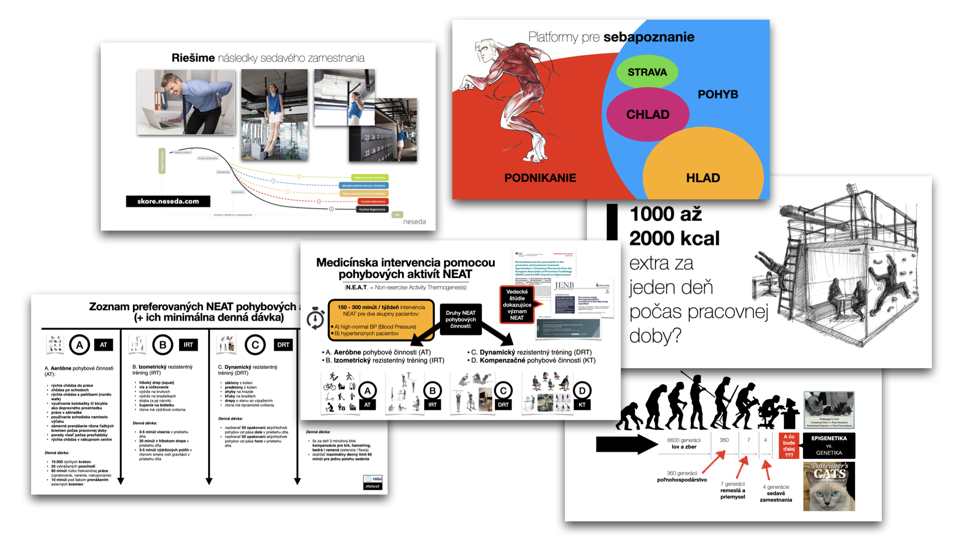 Zdravie sa nedá kúpiť a pokaziť si naše ľudské telo vieme iba raz. Potom s takým pokazeným telom sa musíme naučiť žiť po celý zvyšok života, čiže aj pracovať. Dnešná doba je sedavá, neaktívna a prostredia v ktorých žijeme je chudobné na pohyb. Lenže pohyb treba vnímať ako "výživu" a my sme po väčšinu času čo pracujeme "podvyživení". A to sa nedá dohnať ani hodinovým tréningom za deň! Ten kto trénuje ešte menej, toho problémy sa kumulujú. Čo s tým? Ak chceme zabrániť tomu najhoršiemu (fyzickej degenerácii), musíme to zmeniť. Najprv v našich hlavách (postoje, priority, presvedčenia). A potom inovovať aj kultúru pracovného prostredia (tá ľahšia časť). Kultúra firmy nie je nič iné ako súhrn všetkých akcií, presvedčení a zvykov, ktoré pracovný kolektív ľudí vo firme vykonáva na denno-dennej báze. Každý vie začať od seba, ale najlepšie je, ak s tým začnú uvedomelí majitelia firiem. Na spoločnej prednáške si prezradíme: