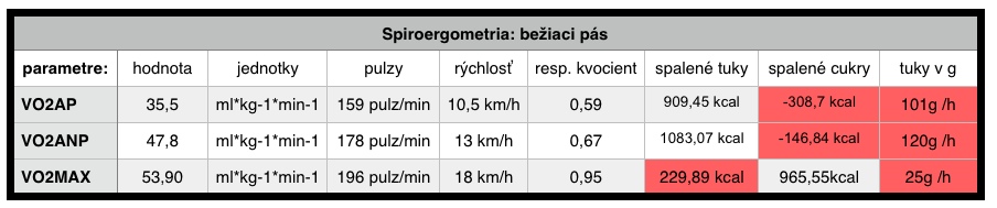 - respiračný kvocient pri VO2MAX 54 = 0,95, pri rýchlosti 18 km/h (čiže spaľovanie tukov ešte aj pri absolútnom maxime, spolu 25g tuku /h),